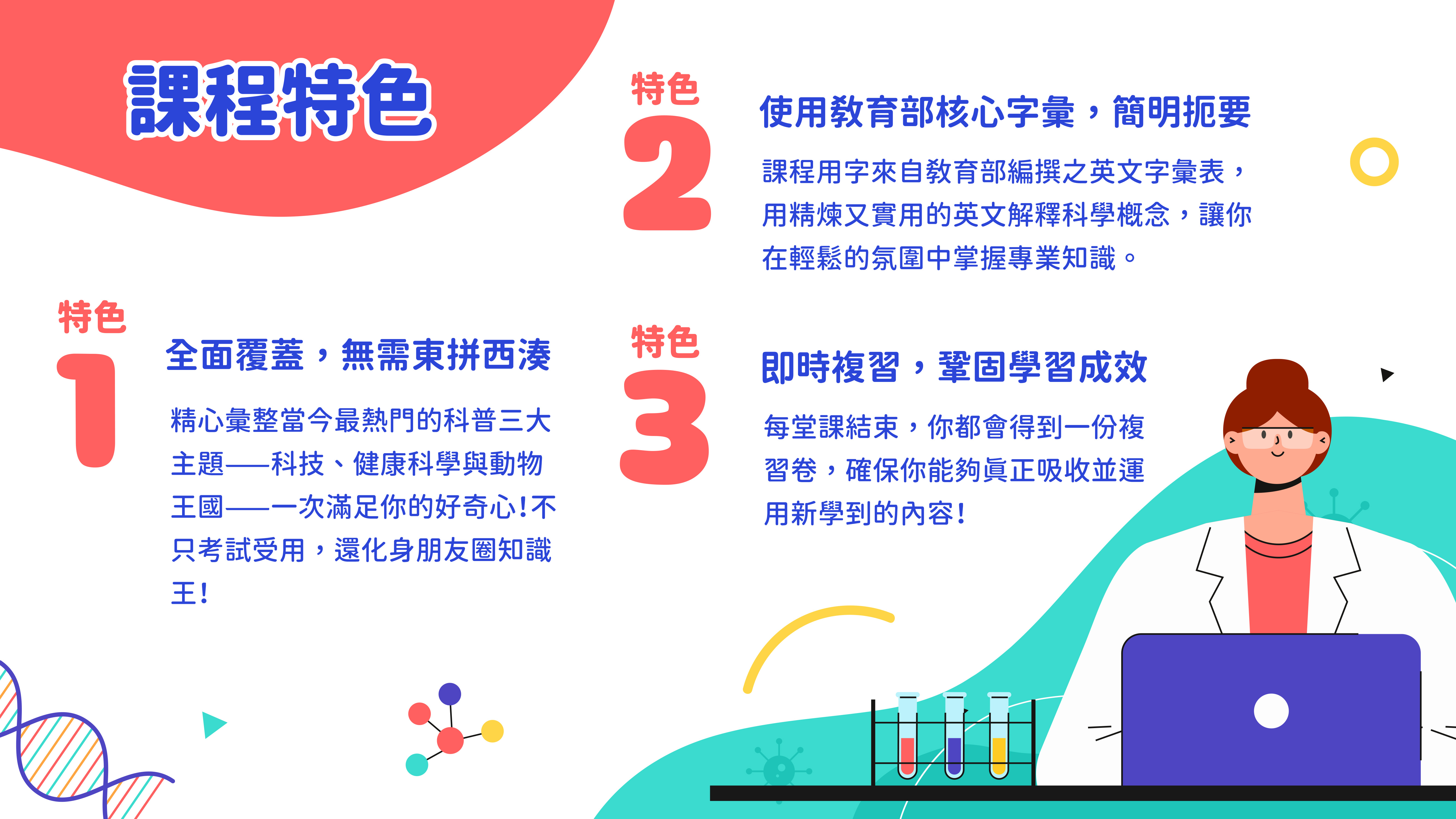 課程用字來自教育部編撰之英文字彙表,用精煉又實用的英文解釋科學概念,讓你在輕鬆的氛圍中掌握專業知識。